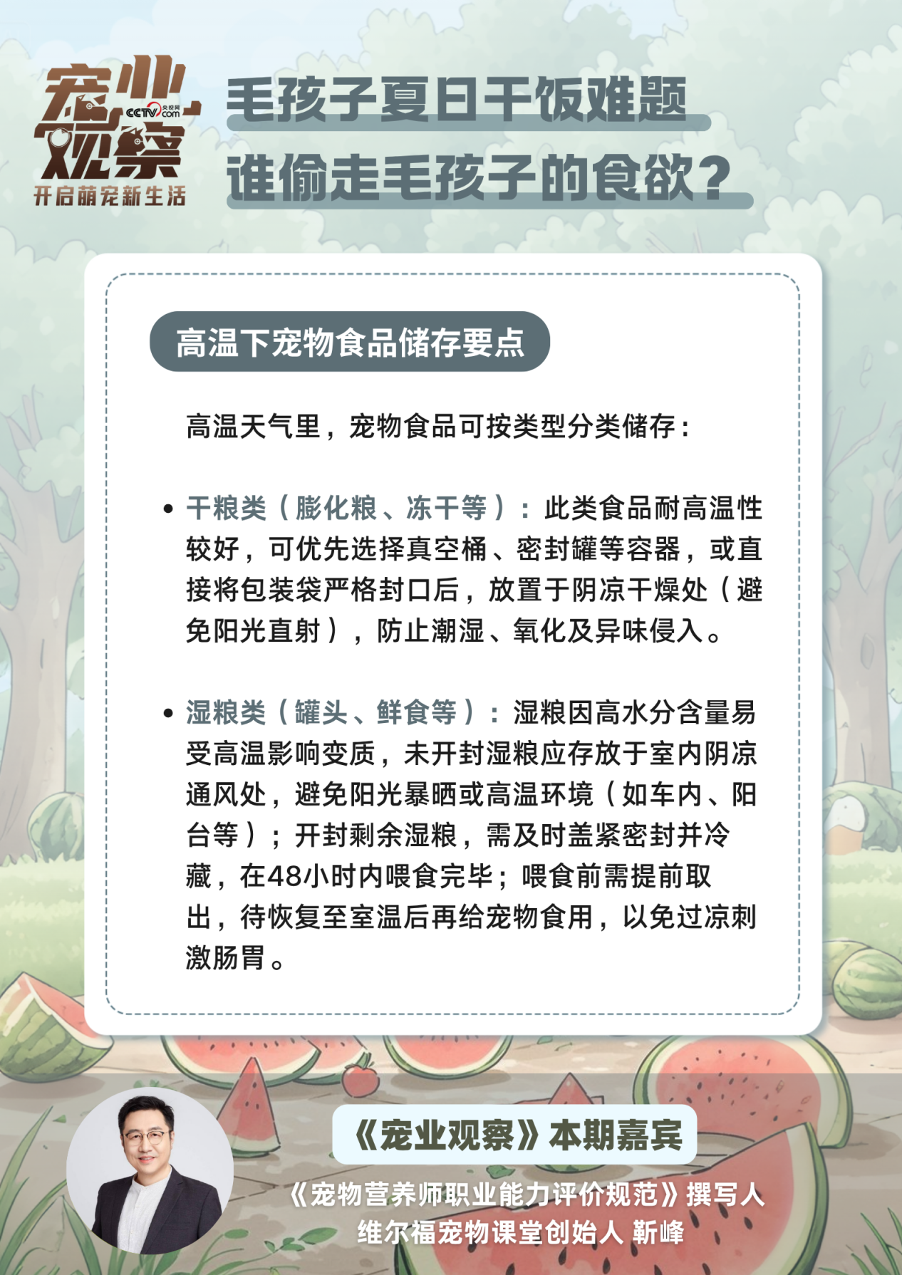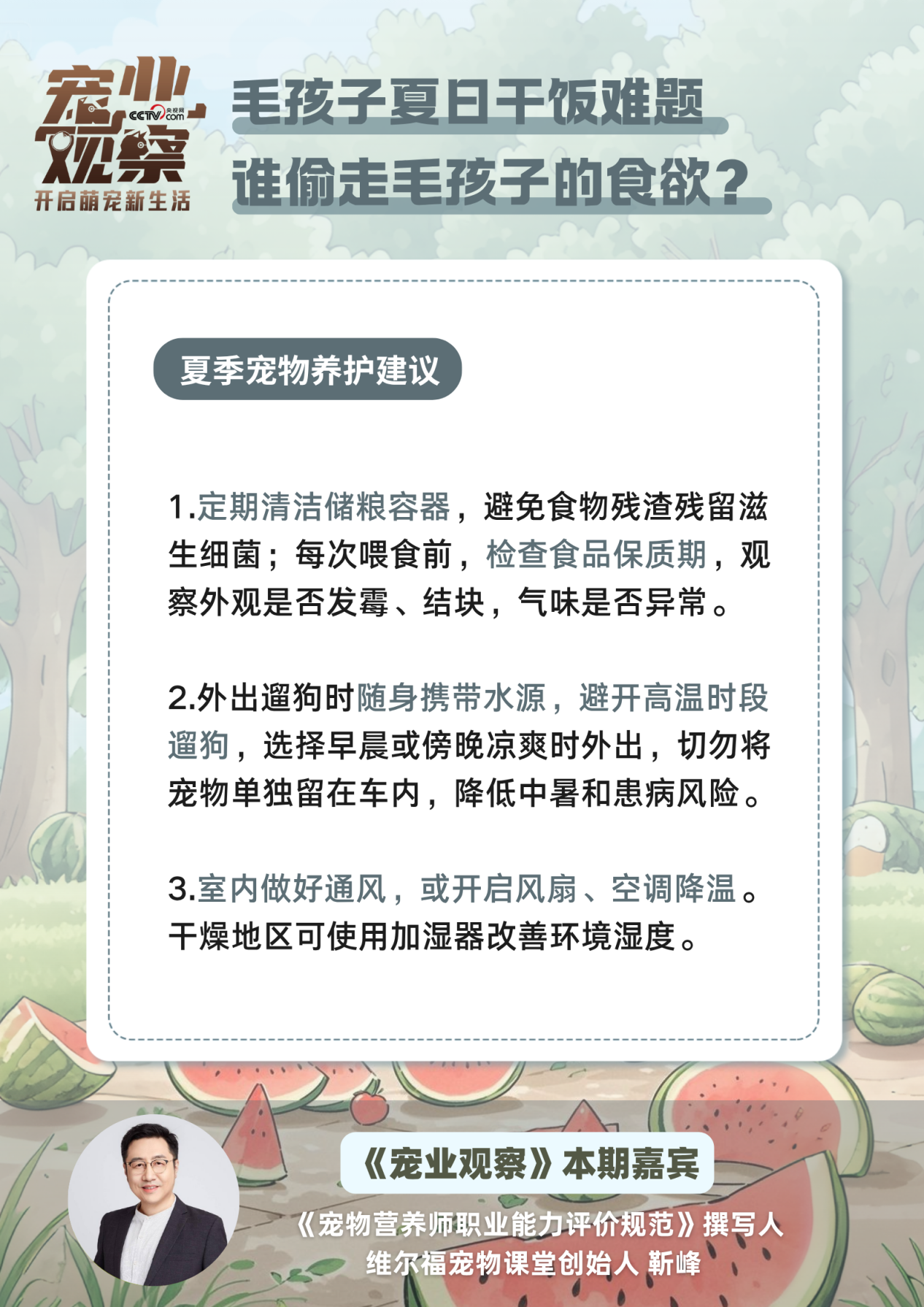 本期《宠业观察》“科学养宠夏日问答”特别策划,邀请《宠物营养师职业能力评价规范》撰写人、维尔福宠物课堂创始人靳峰,为毛孩子家长们拆解夏日养宠难题,守护毛孩子的健康与活力。