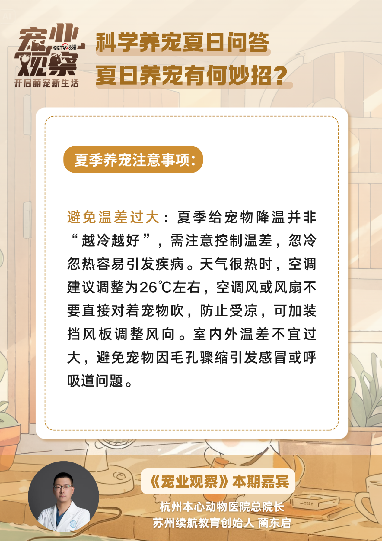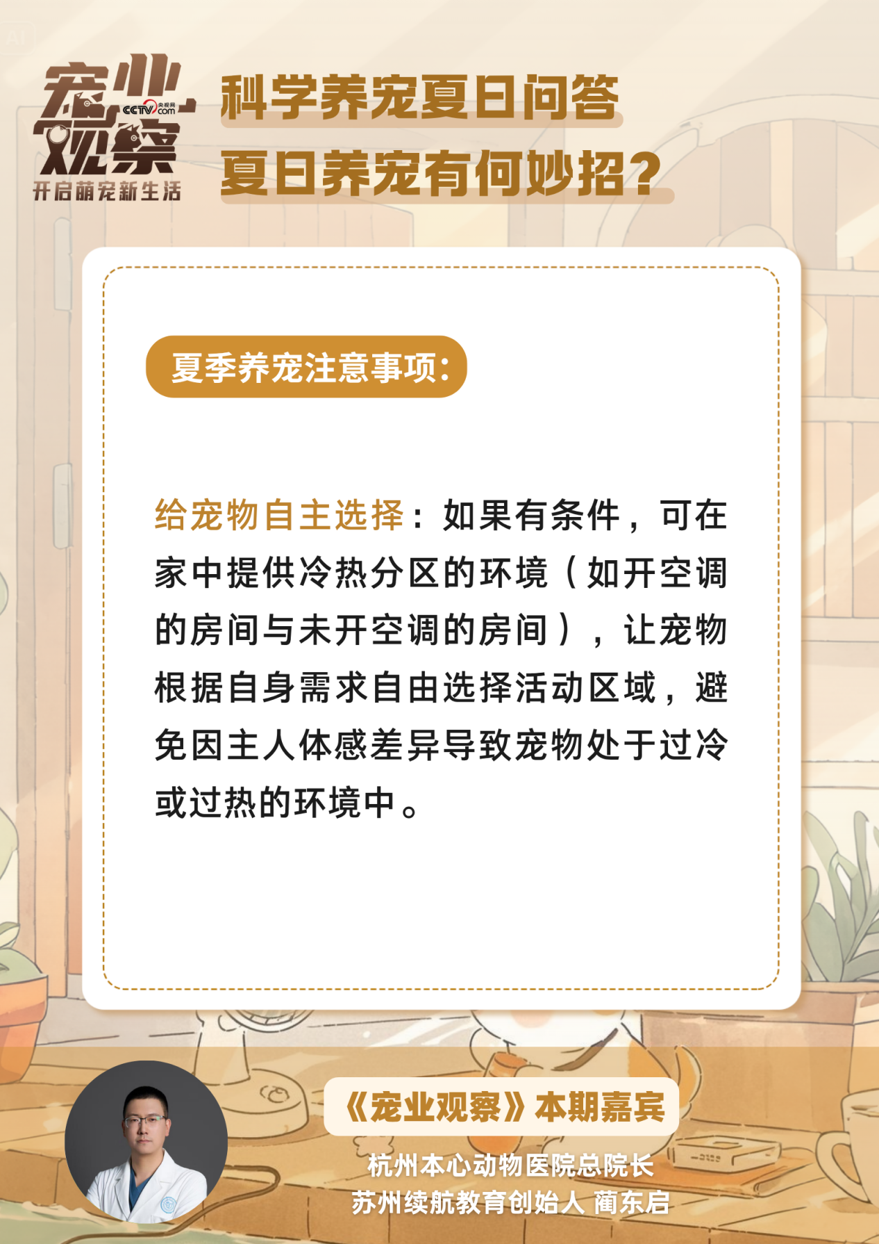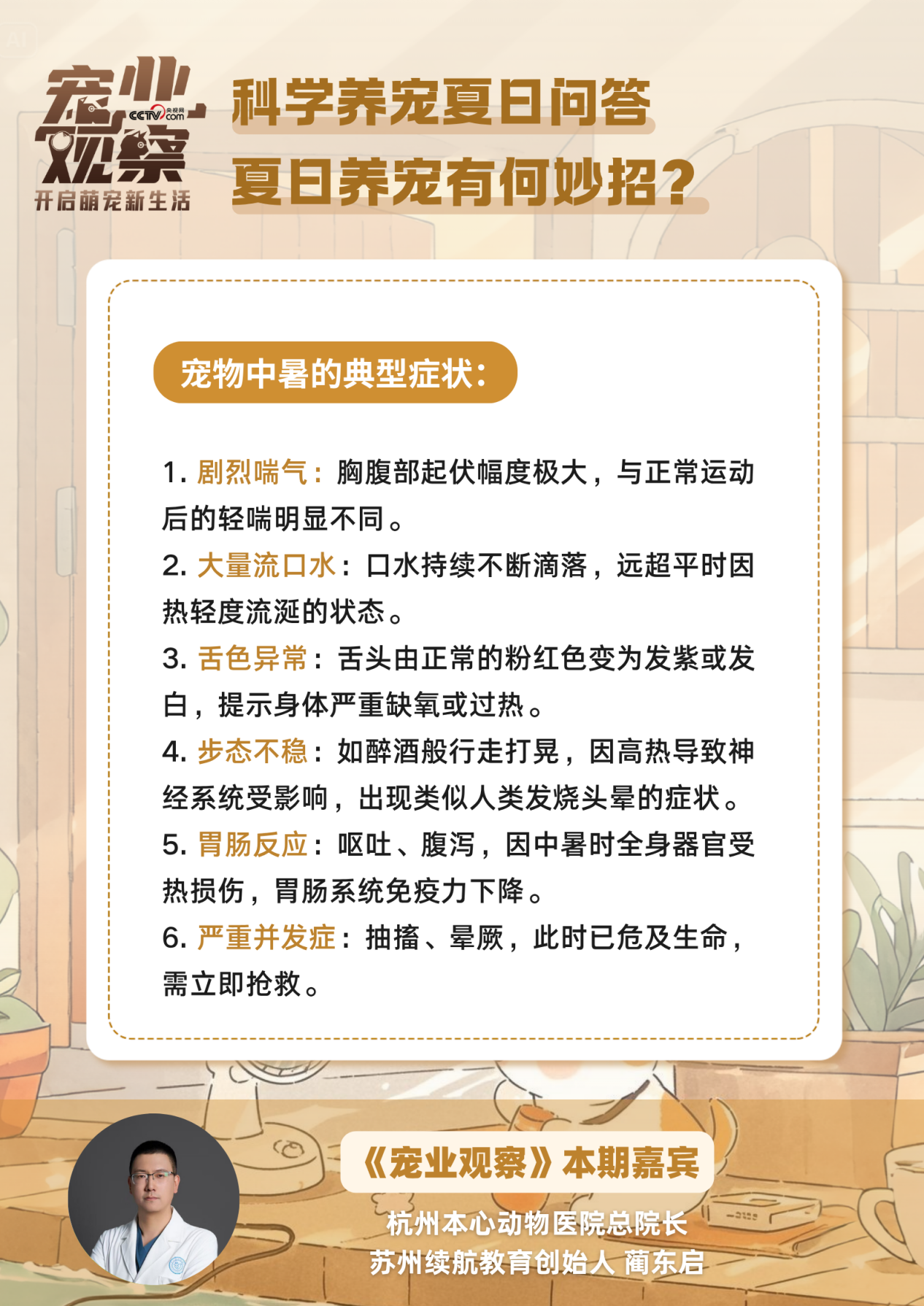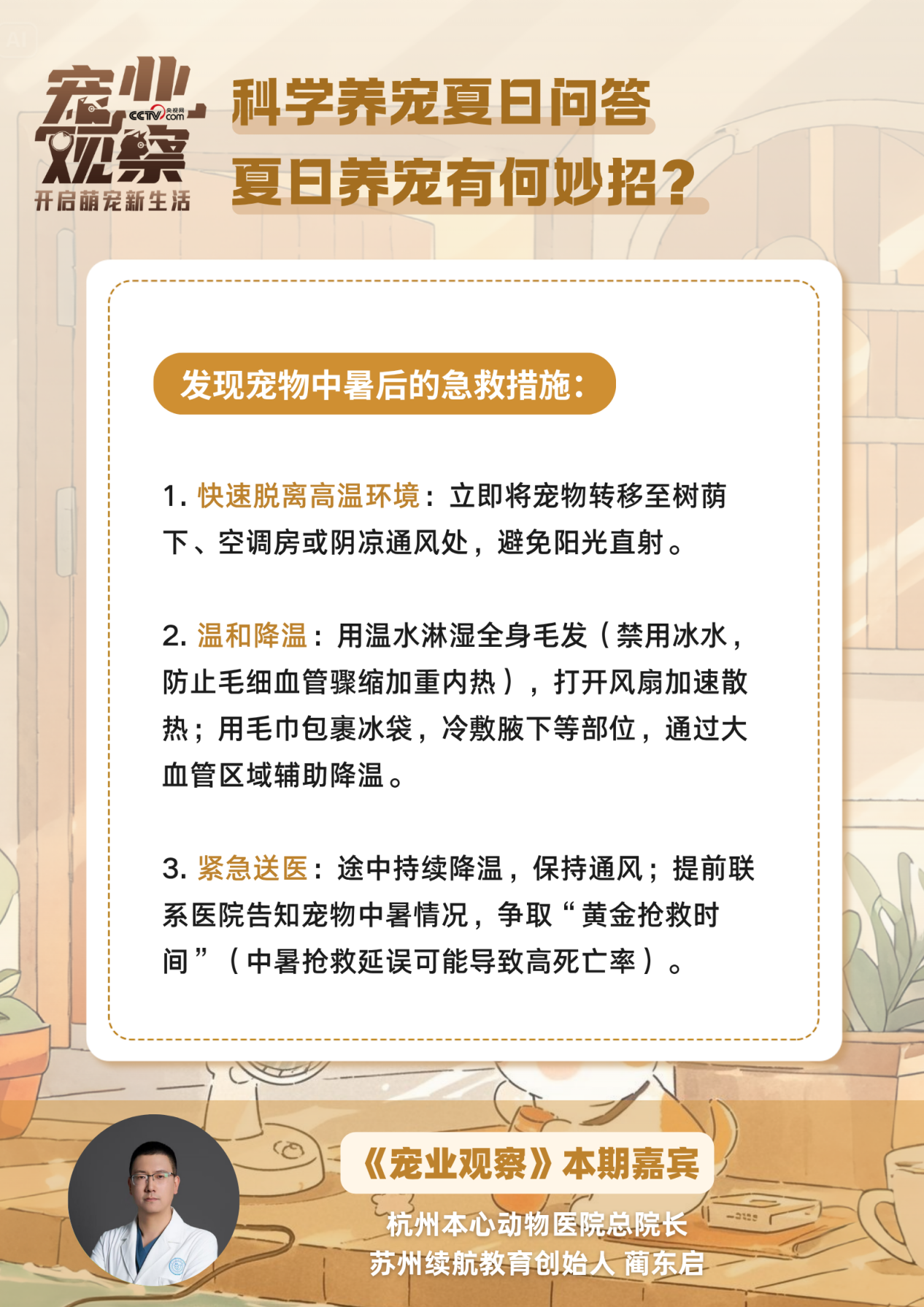 别急,本期《宠业观察》“科学养宠夏日问答”特别策划,邀请杭州本心动物医院总院长、苏州续航教育创始人蔺东启,带你识别毛孩子的中暑“求救信号”,get急救小技巧,化解中暑危机。