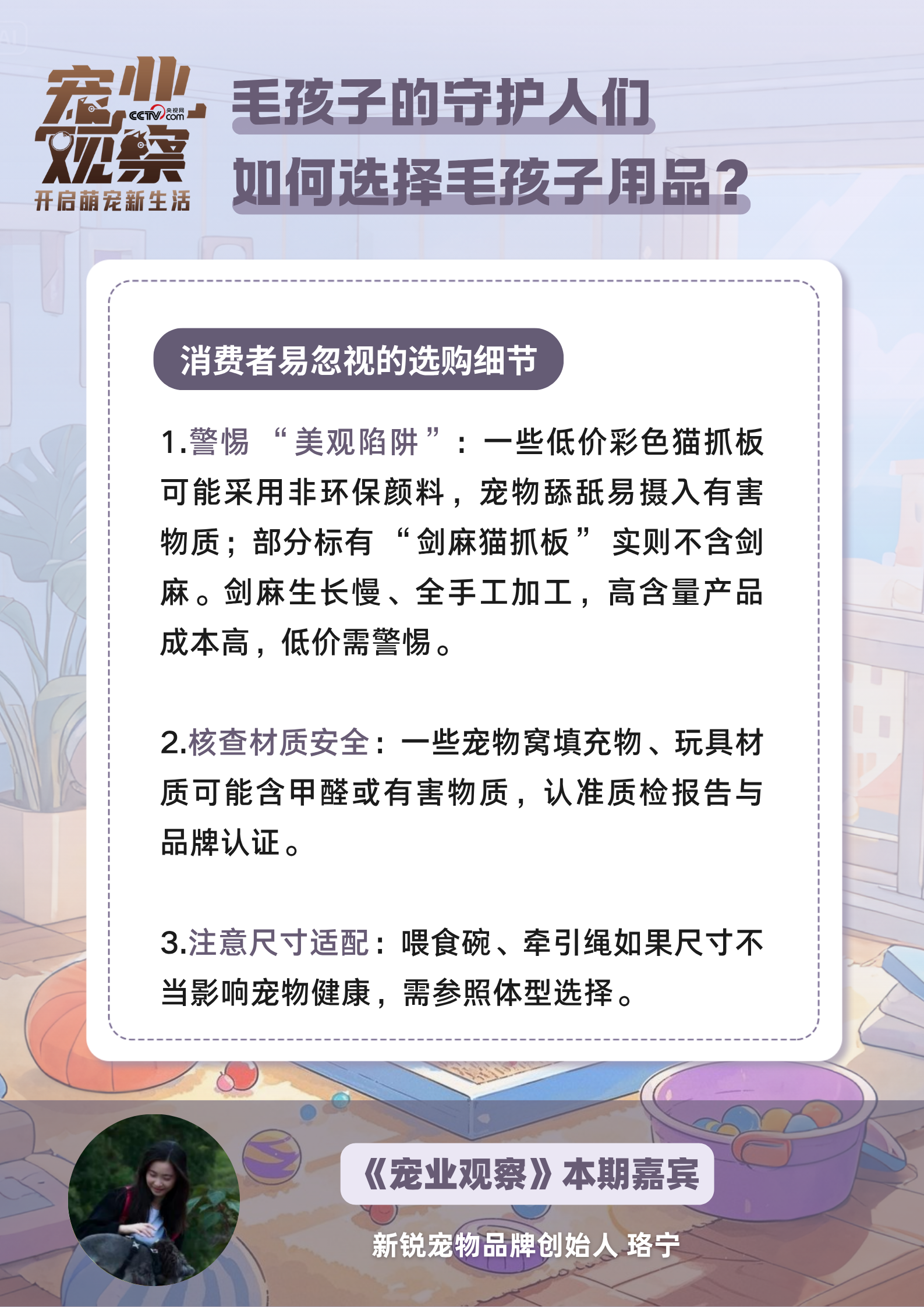 1.选购宠物用品时,需警惕美观陷阱、核查材质安全并注意尺寸适配,从价格、资质认证及实物鉴别等核心要点入手。