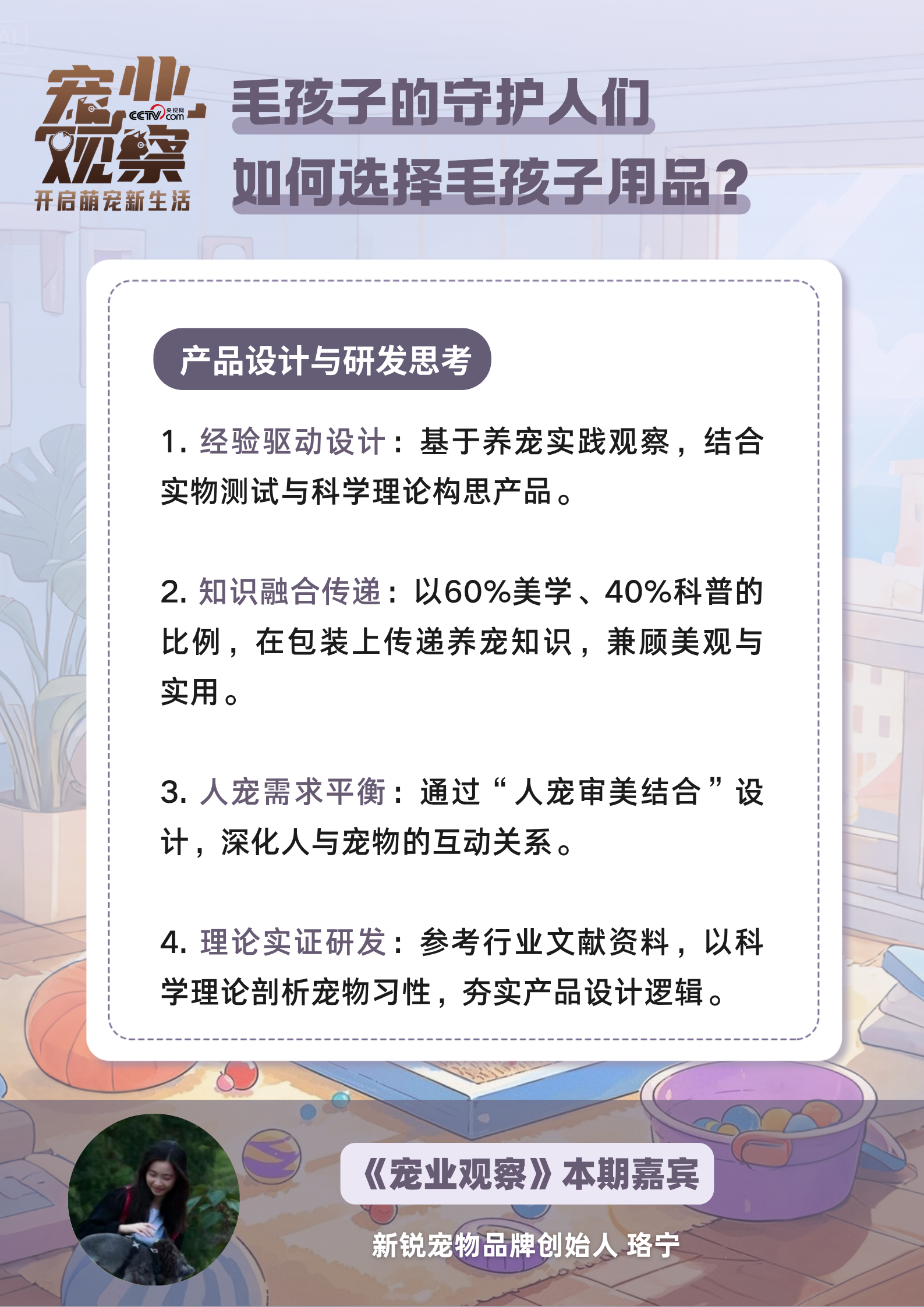 日前,《宠业观察》“毛孩子的守护人们” 专栏对话新锐宠物品牌创始人珞宁,听她分享关于宠物用品安全与人宠互动设计的思考。