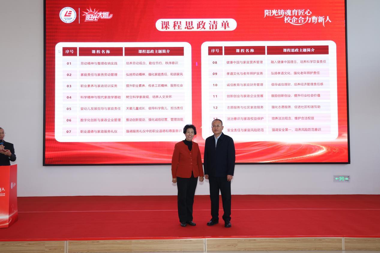 活动现场,双方共同为“大思政课”实践教学基地和课程思政实践基地揭牌,发布了首批校企“课程思政”共建清单和“阳光魂·匠心根”师资培育计划。共建清单系统梳理了阳光大姐在服务标准、劳模精神、典型案例等方面的优质资源,将其转化为思政教学的鲜活素材;师资培育计划则围绕“管理培训、技能培训”两大类,开展“家政经理人、家政培训师、家政服务员”等八个方面实施师资培育工程,打造校企互通的"双师型"教学团队。