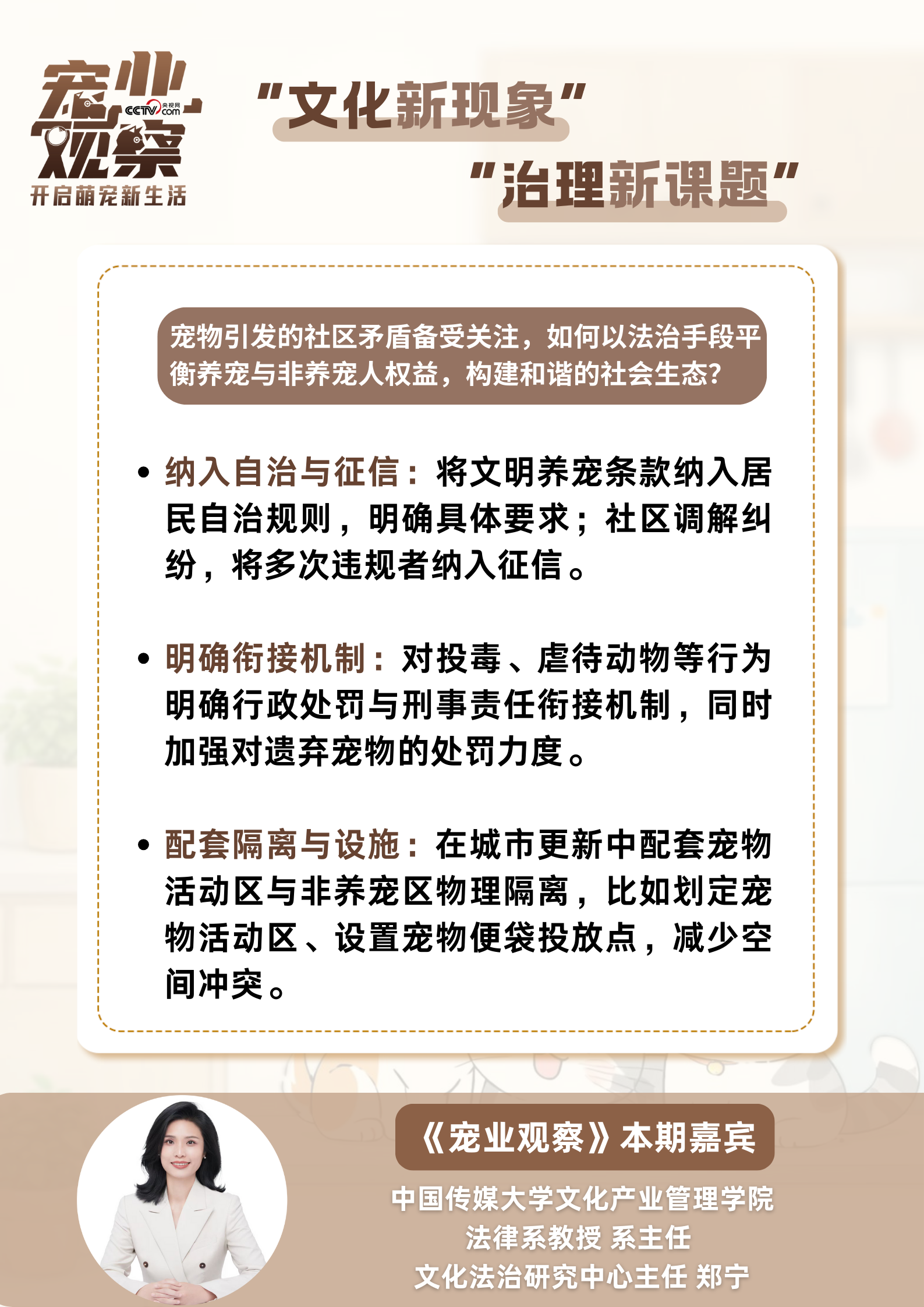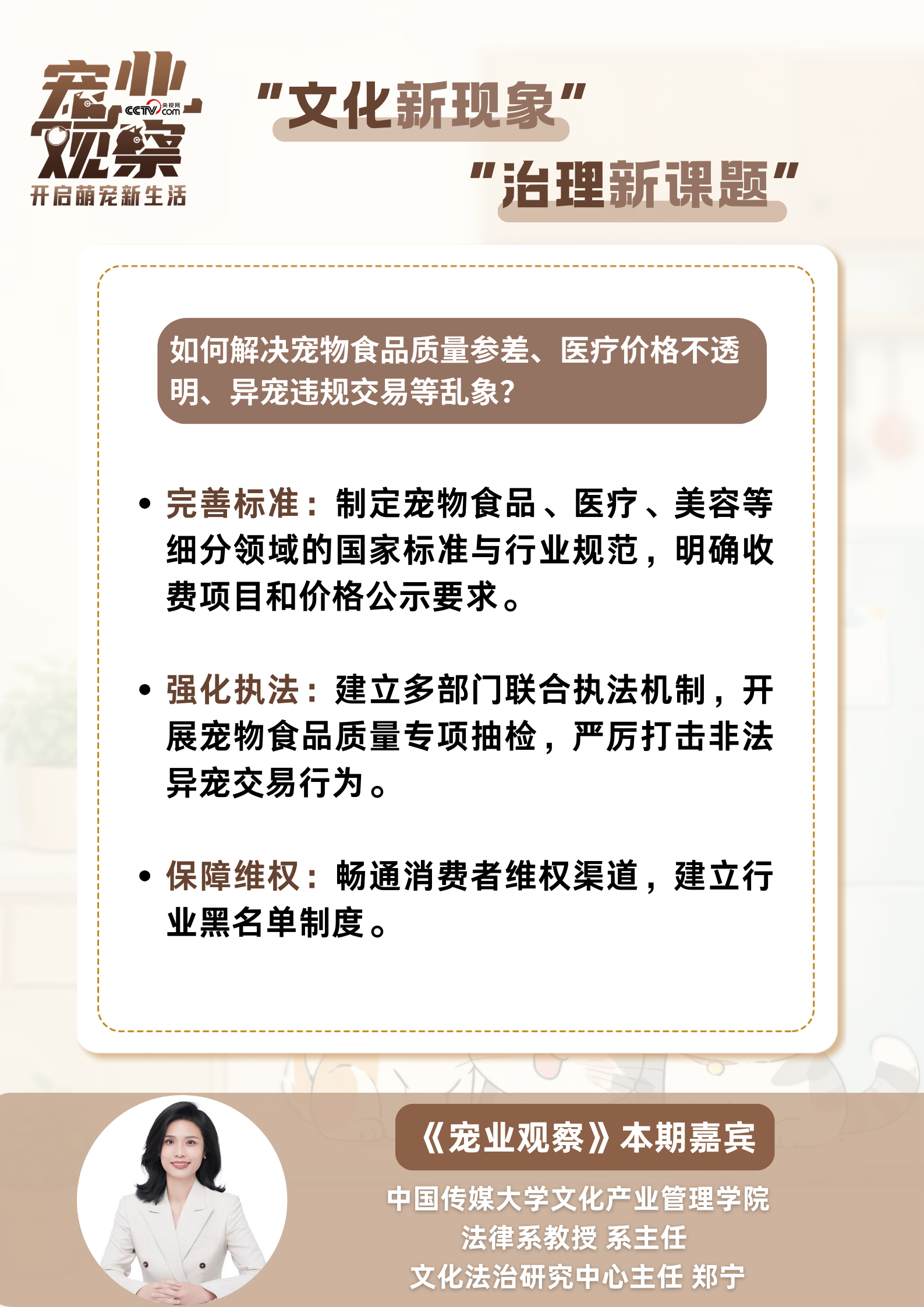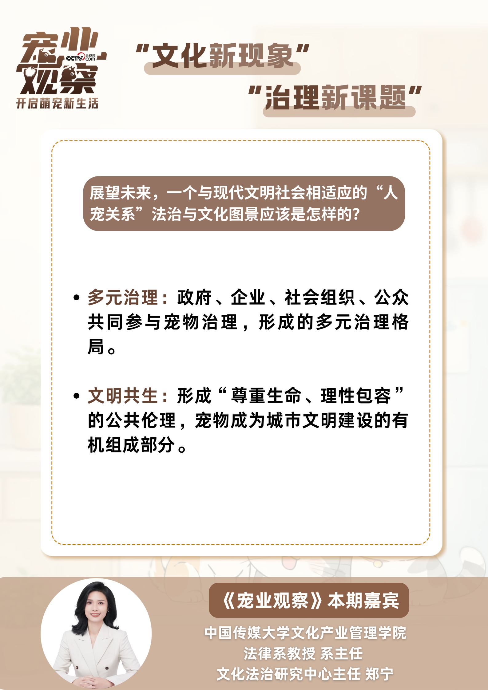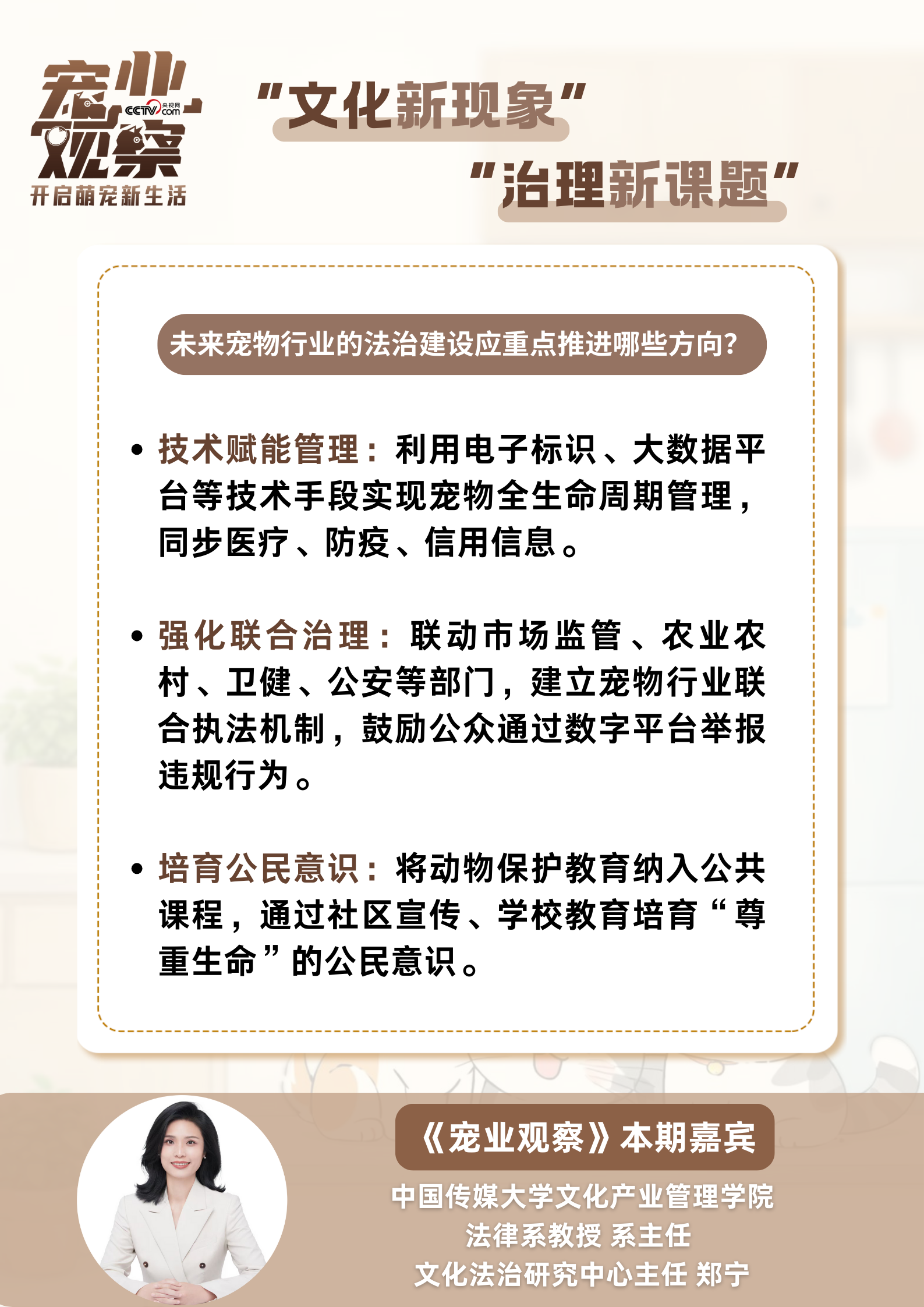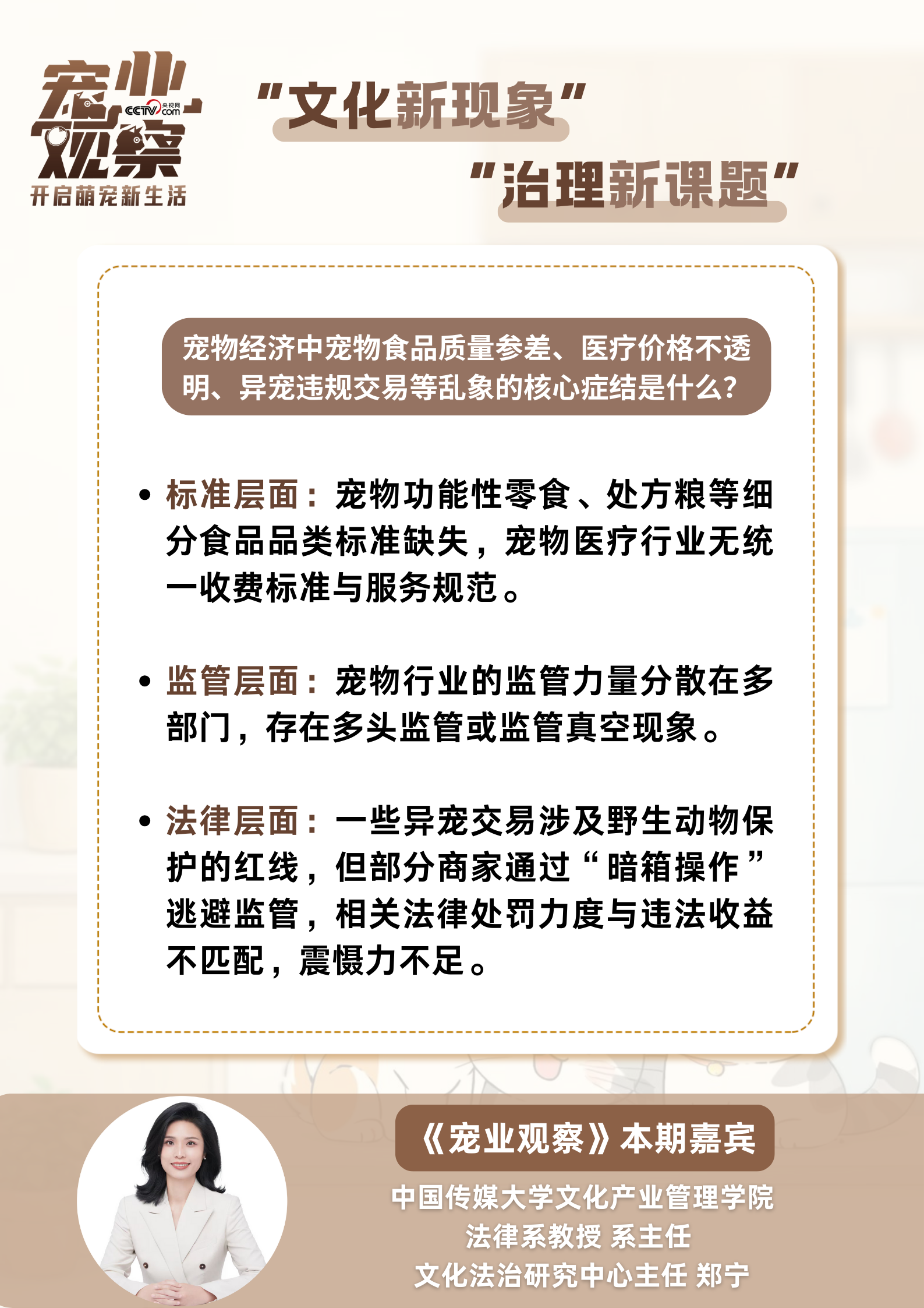 日前,《宠业观察》“毛孩子的守护人们”专栏,邀请中国传媒大学文化产业管理学院法律系教授、系主任、文化法治研究中心主任郑宁,解读宠物热潮背后的治理难题与破解路径。
