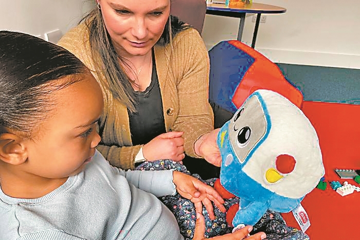3岁的米娅和她的妈妈维基在剑桥大学教育学院进行观察期间,与AI玩具“加博”玩耍。图片来源:英国剑桥大学
