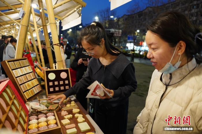 3月27日,河南郑州非遗夜市持续升温,传统技艺与国潮创意碰撞,吸引众多市民前来打卡体验。图为市民在非遗夜市摊位前挑选牡丹香包。赵梦阳 摄