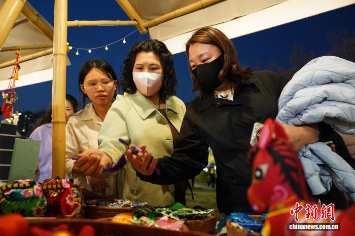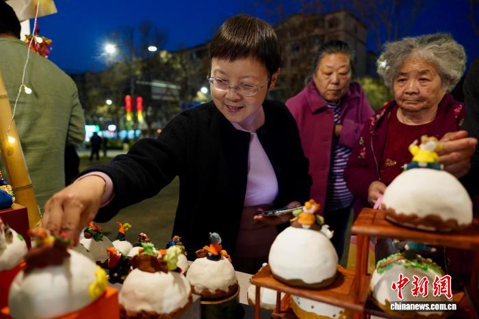 3月27日,河南郑州非遗夜市持续升温,传统技艺与国潮创意碰撞,吸引众多市民前来打卡体验。图为市民在非遗夜市摊位前挑选面塑。赵梦阳 摄