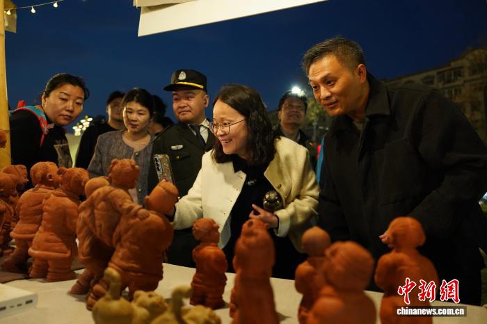 3月27日,河南郑州非遗夜市持续升温,传统技艺与国潮创意碰撞,吸引众多市民前来打卡体验。图为市民在非遗夜市摊位前挑选泥塑。赵梦阳 摄